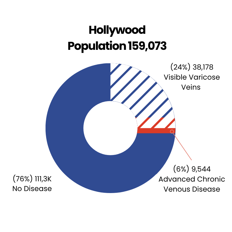 In Hollywood, with a population of 159,073, about 38,178 residents are likely to experience visible varicose veins, and another 9,544 may suffer from more advanced chronic venous disease.