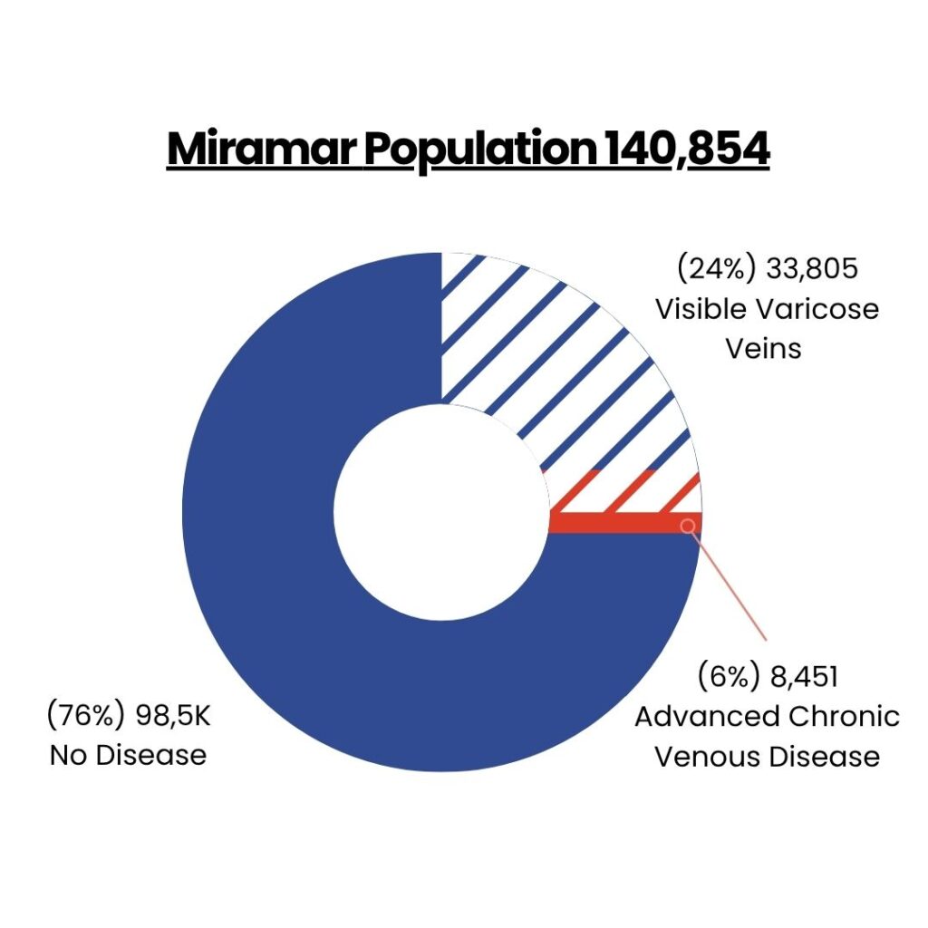 With 140,854 residents, Miramar likely has 33,805 people with visible varicose veins and 8,451 dealing with advanced venous issues.