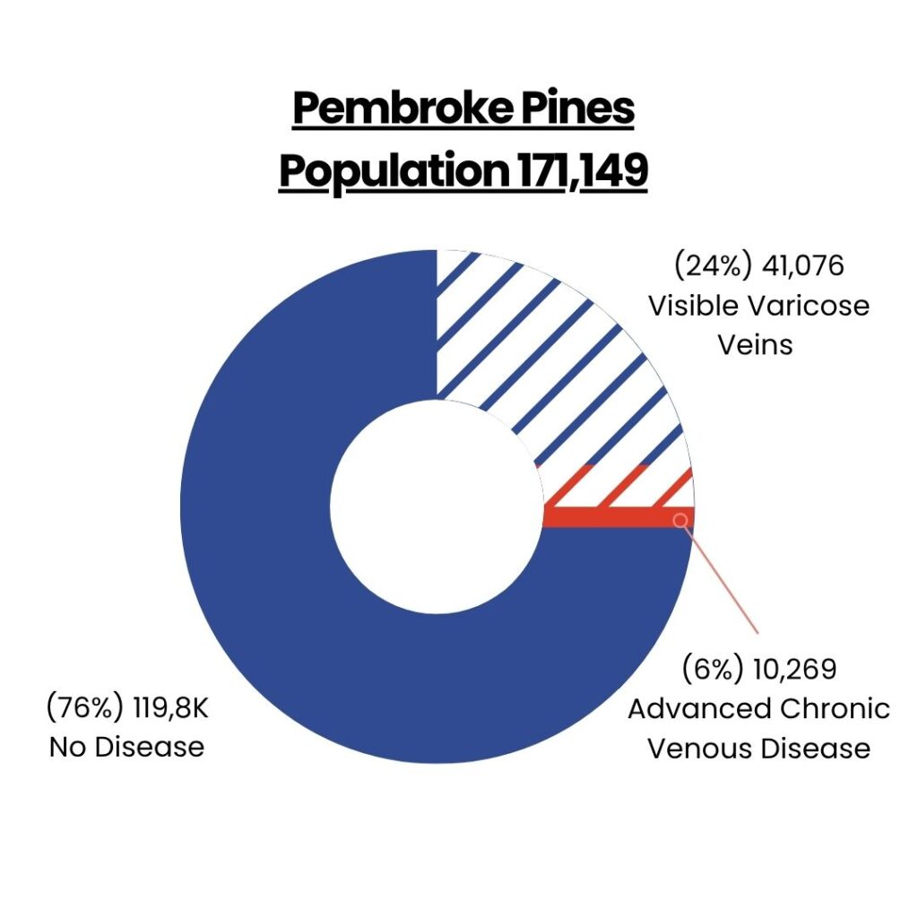 Pembroke Pines, with a population of 171,149, may have 41,076 people affected by visible varicose veins and 10,269 living with advanced venous conditions.