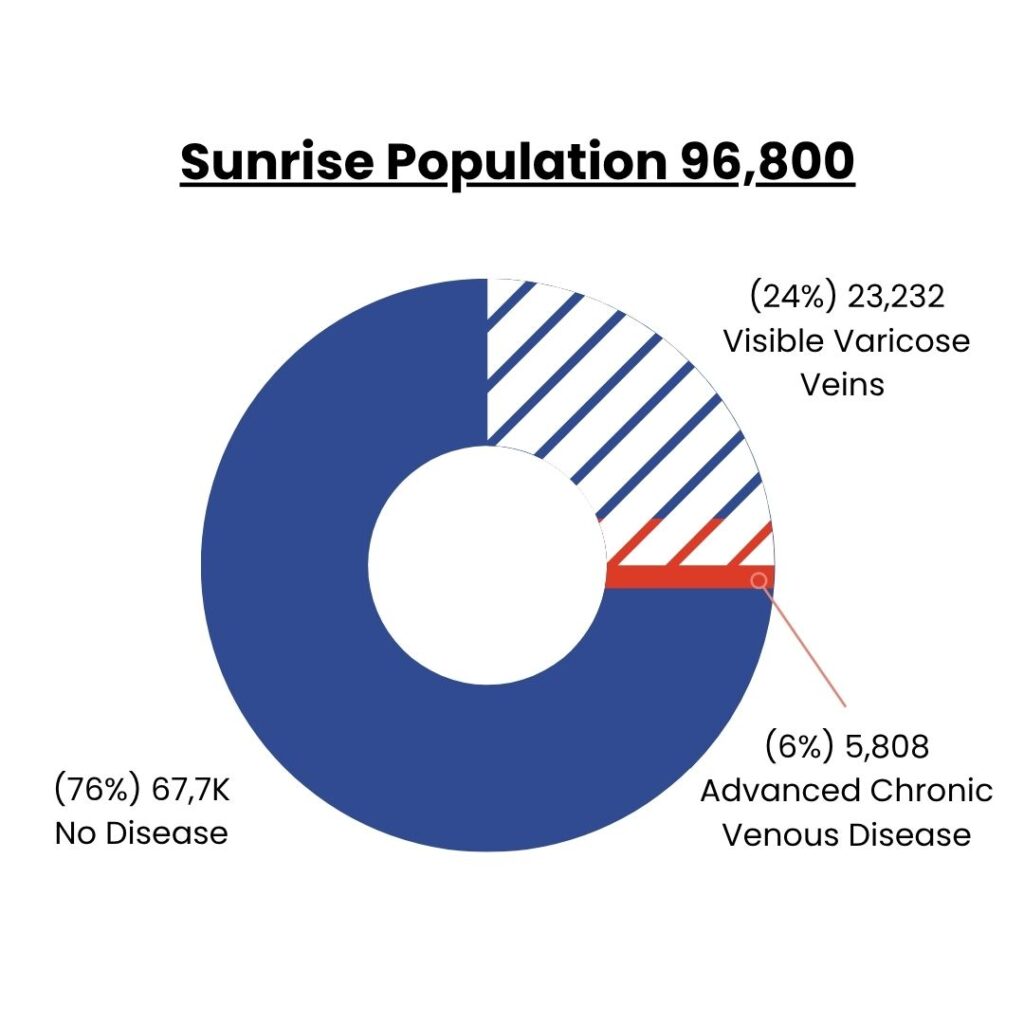 Sunrise, with 96,800 residents, has approximately 23,232 living with visible varicose veins and 5,808 with advanced venous conditions.